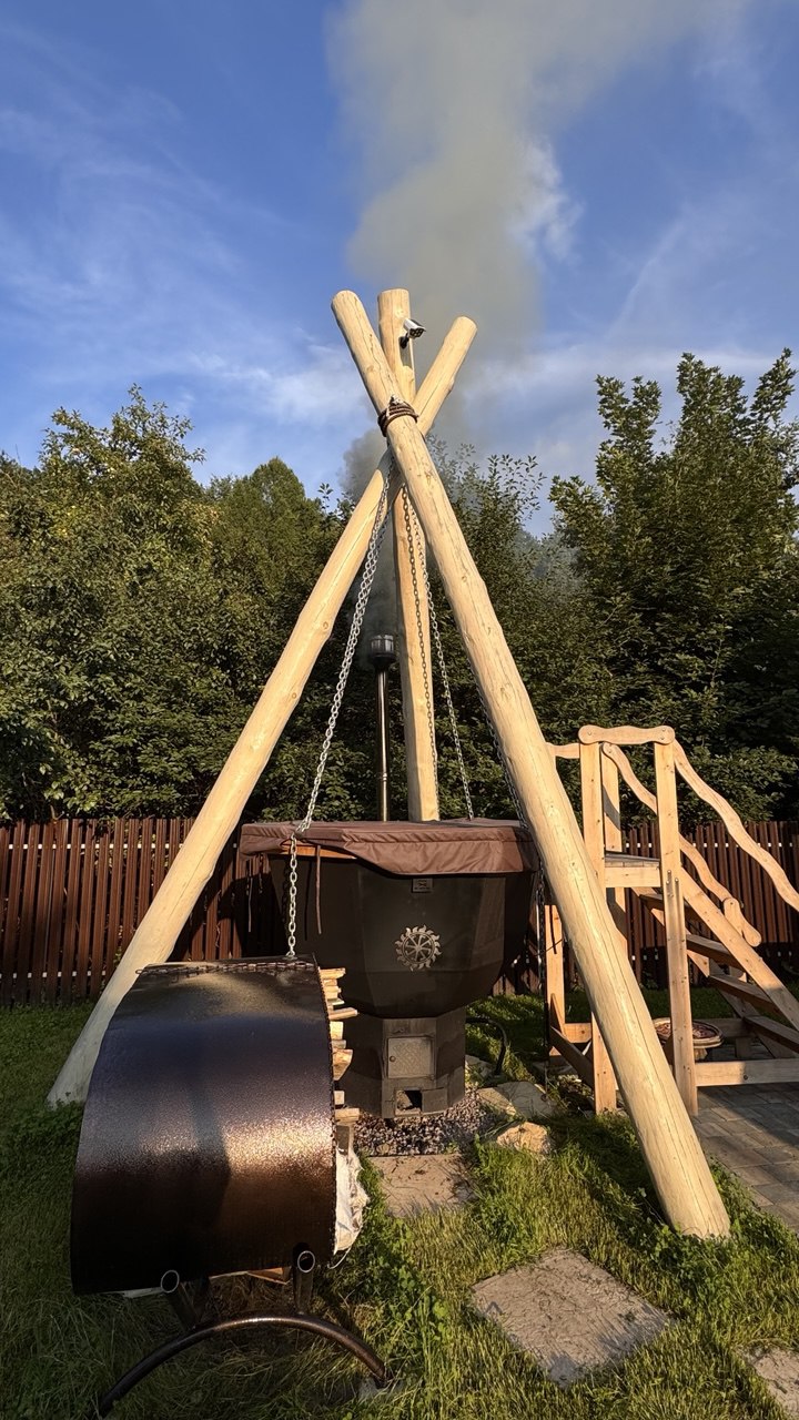 Муж очень тщательно подошел к вопросу выбора чана: долго изучал рынок, думал, советовался, какой лучше установить. Он сразу хотел, чтобы чан был подвесной на бревнах, я же предлагала поставить более простой — на подставке. Но нужно признать: этот чан прекрасно вписался в стиль нашего двора и создал невероятный антураж. Правда, и сложностей с покупкой и установкой тоже хватило.